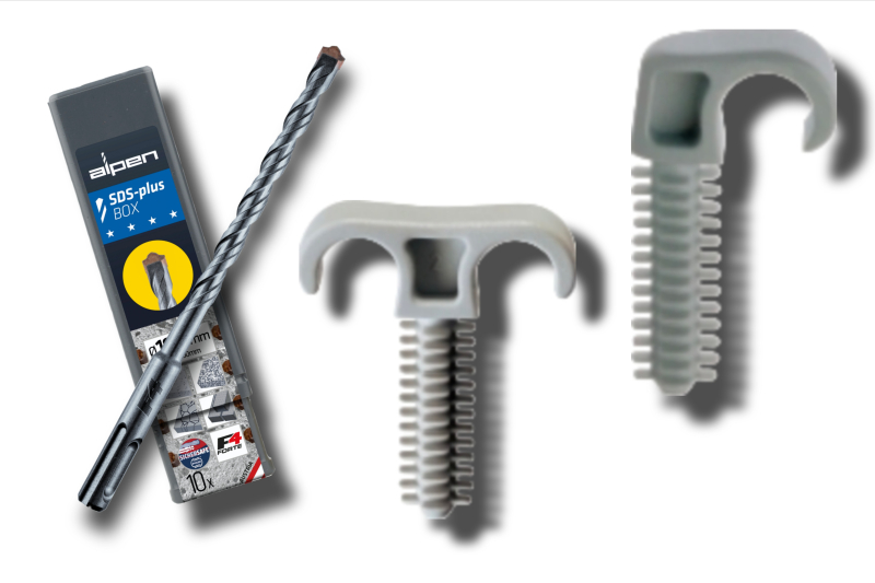 Unser Stecksystem zur Befestigung von Leitungen NYM 3x1,5; bzw. 5x1,5; auf Beton, Vollstein oder Gas/Porenbeton (Verarbeitung s.u.). Dieses Befestigungsteil kann somit dort genommen werden, wo normale Nagelschellen mit Stahlnägeln nicht verarbeitet werden können.